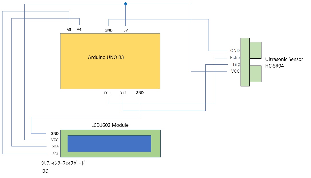 ※スケッチは多くの方がネットや動画で公開しているものを参考にしています。 <スケッチ> //距離センサーで測定した結果をLCDに表示させる #include//NewPingライブラリーを使用 //NewPing_v1.9.1.zipをダウンロードしてインクルードする。 #include //I2Cアダプターを使用 //LiquidCrystal_I2C-master.zipをダウンロードしてインクルードする。 const int PIN_SONAR_TRIGGER = 12; const int PIN_SONAR_ECHO = 11; const int MAX_DISTANCE = 200; NewPing sonar(PIN_SONAR_TRIGGER, PIN_SONAR_ECHO, MAX_DISTANCE); LiquidCrystal_I2C lcd(0x27, 16, 2); void setup(){ lcd.init(); lcd.backlight(); lcd.clear(); } void loop() { delay(50); unsigned long microSec = sonar.ping_median(); //距離を5回測定して中央値をとる unsigned long dist = sonar.convert_cm(microSec); //測定したμsをcmに変換 lcd.clear(); lcd.setCursor(0, 0); if( !dist ){ return; } else{ String s = String(dist); s += "cm"; lcd.print(s); //lcdに出力 } }