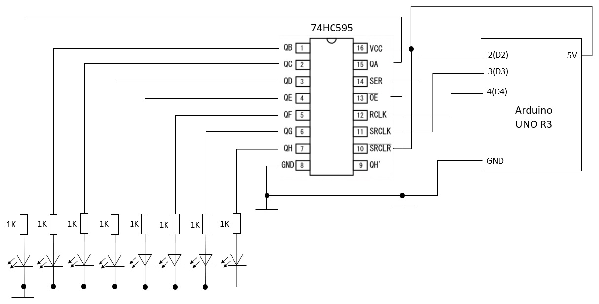 //シフトレジスタ(74HC595)でLEDを制御するプログラム