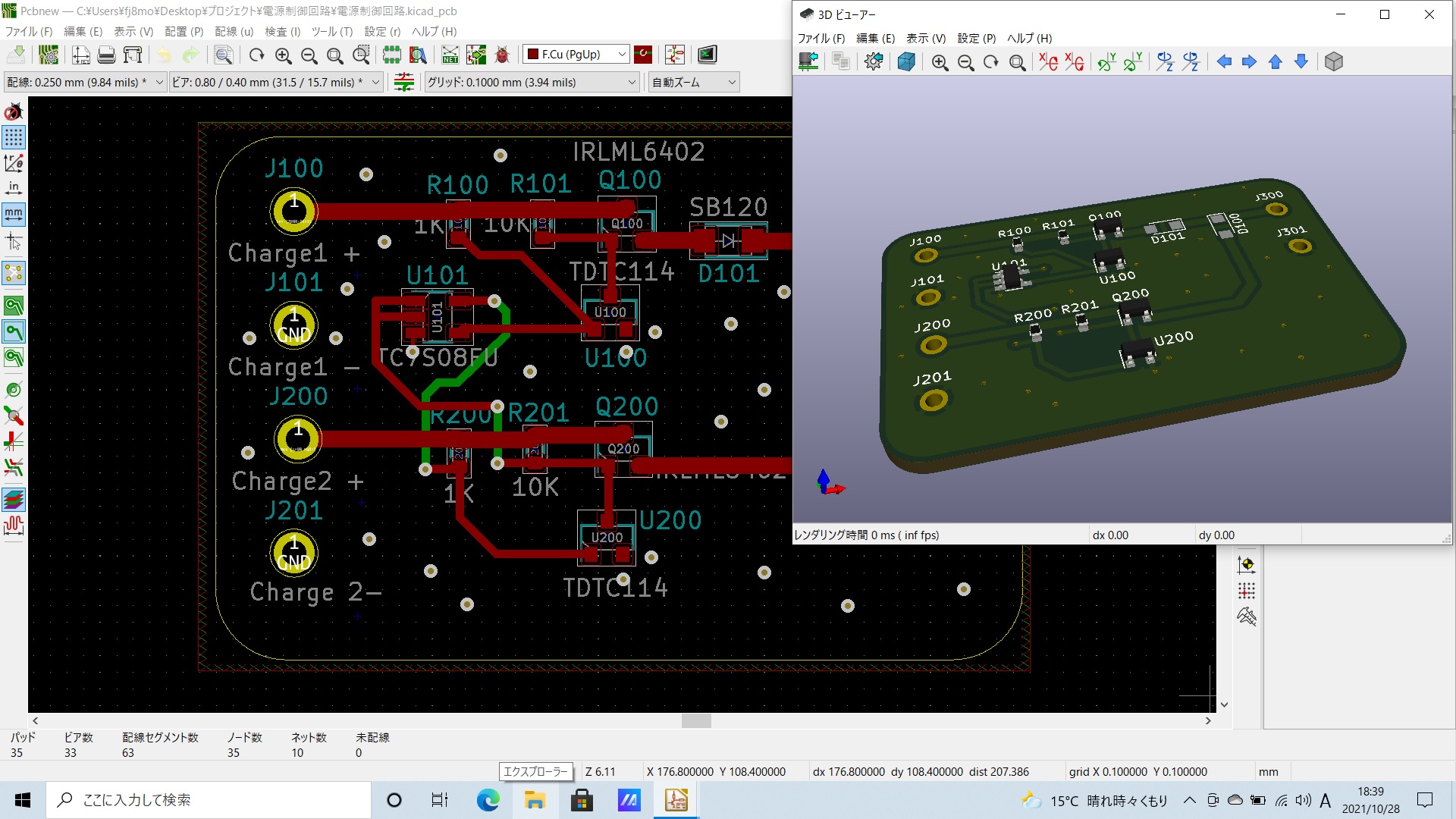 回路図同様にKiCadでプリント基板を設計しました。 3Dビュアーで出来上がりを確認して、問題なさそうなのでこれでOKとしました。