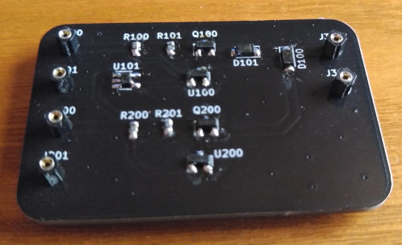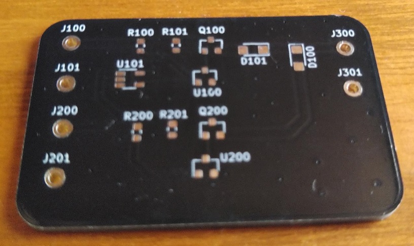 KiCadでガーバーデータを作成して、プリント基板製造メーカに製造を発注。 今回発注したのは、中国深センにあるFUSION PCBという受託メーカです。 今回設計した基板のサイズは48mm×30mmと小さいので、最小ロット5枚で500円くらいでした。 これに、エア代の$20がかかりますが、それでも3000円程度なので激安です。発注から納品まで7〜9日くらいでした。 下図が納品した基板です。レジストの色を黒で指定したのですが、ちょっとパターンが見づらいので定番の緑で製造すればよかったなと思っていま す。しかし、出来上がりには満足しています。 基板製造メーカはFUSION PCBの他にPCBGOGOも何度か使用しました。こちらも価がも安くて、さらに納期が7日くらいです。 個人の工作レベルでの基板は、中国のメーカは非常に助かります。