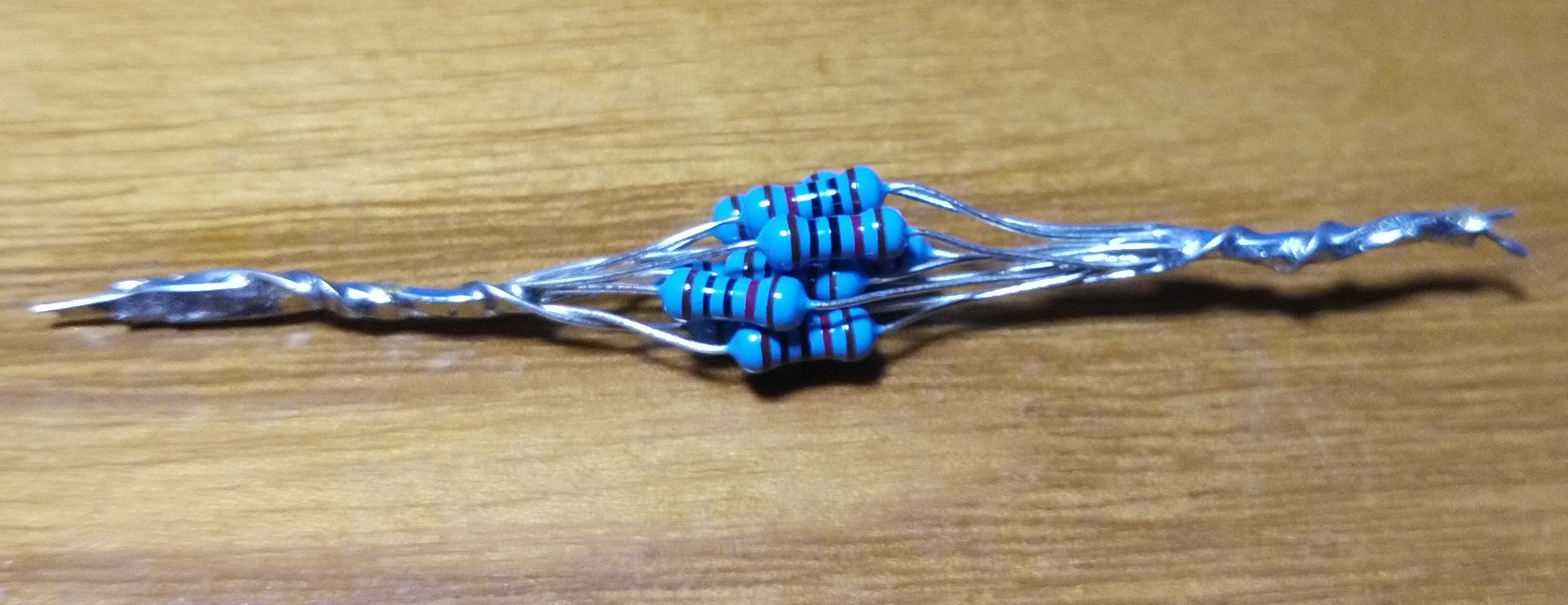 負荷抵抗ですが、今回は5Vで300mAを流す設計でしたので、抵抗値は16Ωで消費電力は1.5Wです。 しかし、私が持っている抵抗は1/4Wしかなく120Ωを8個並列接続すること15Ωとなり消費電力は2Wとなります。 まあこれで何とか抵抗が焼けることはないと思います。