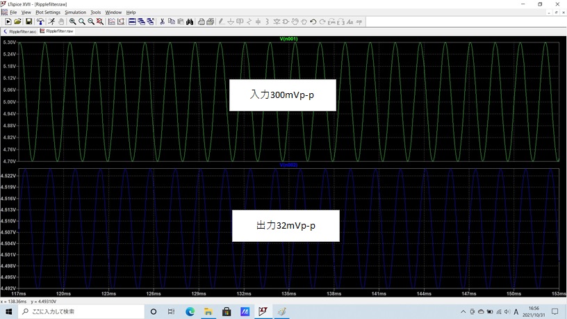 上図シミュレーション結果より、出力は32mVp-pです。0.032/0.3=10.6%となり約1/10になっていますので目標達成です。