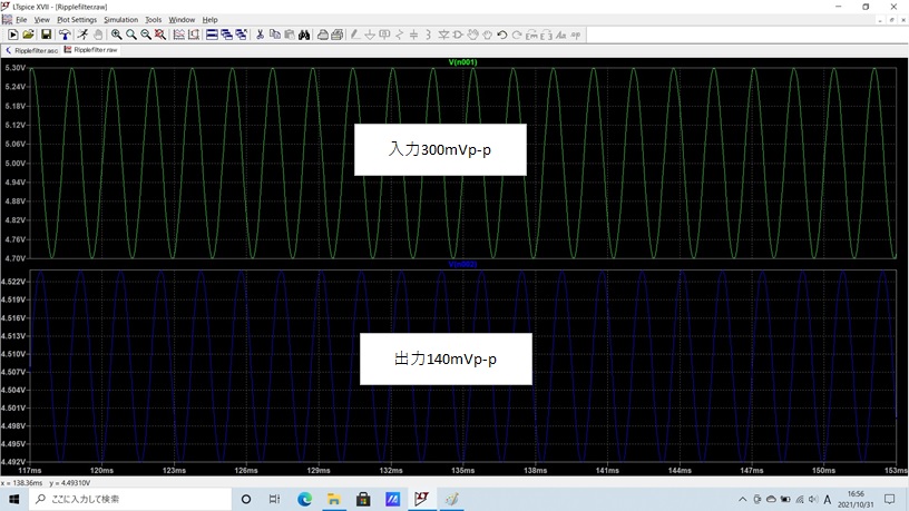 本来は、リップル周波数からカットオフ周波数を算出するのでしょうが、シミュレーションでRCの値を変えて目標の結果になるようにしました。