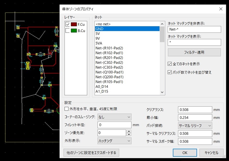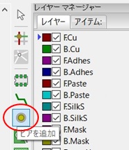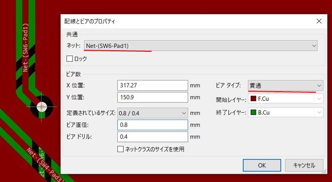 ※パターンとの接続の場合は、下記のようにネットを確認する。また、ビアタイプは”貫通”を選択する。