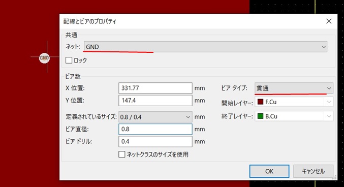 ※ベタGNDとの接続の場合は、下図のようにネットは”GND”、ビアタイプは”貫通”を選択する。