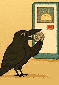 Triumphant, he cawed loudly, waking the baker who peeked outside and saw the clever thief. Instead of chasing him away, the baker laughed and placed a small sign on the machine: "One bun per crow per day."