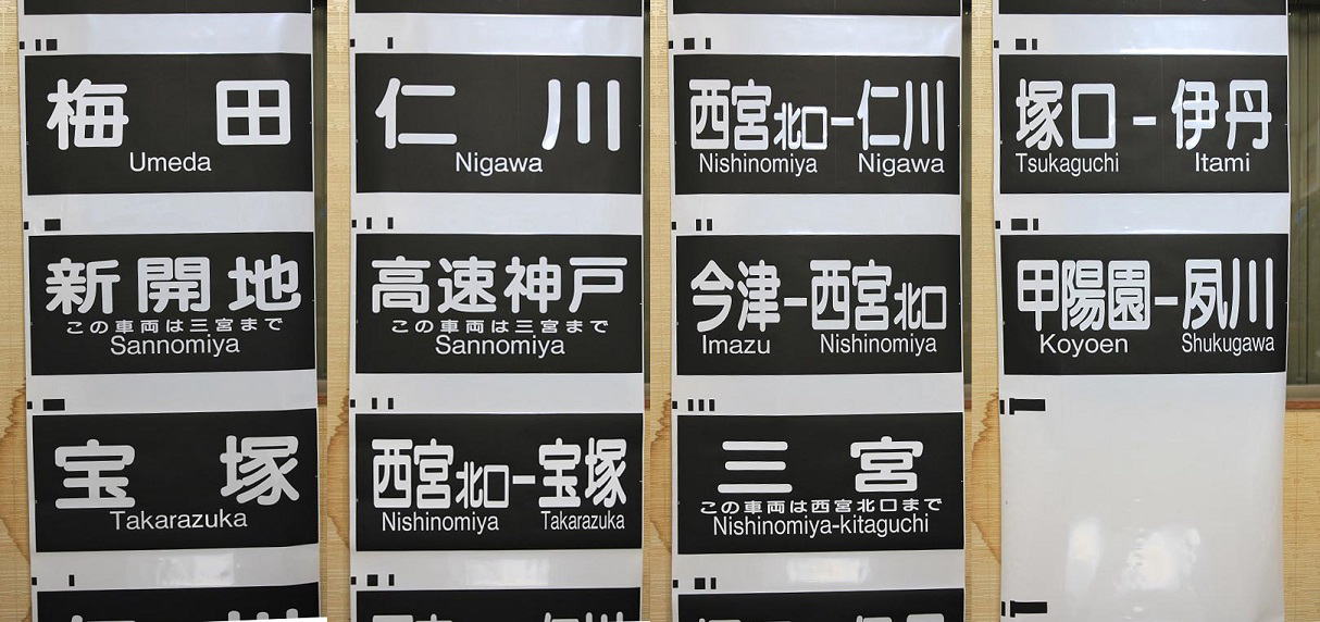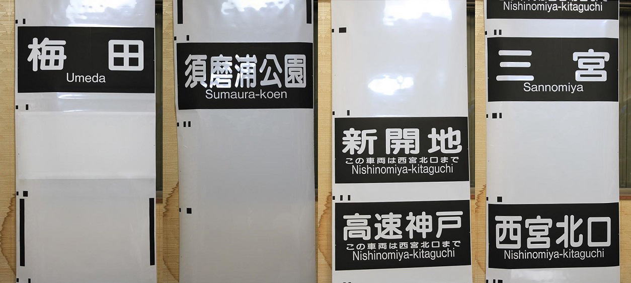 神戸線増結車両用SPC式の行先幕。縦幅が広いので8000系後期型か8200系に使われていた物です。 新開地・高速神戸は切離し表記があるものしかなく、ノーマル表記がない。宝塚・塚口の塚の字は新字になっている。