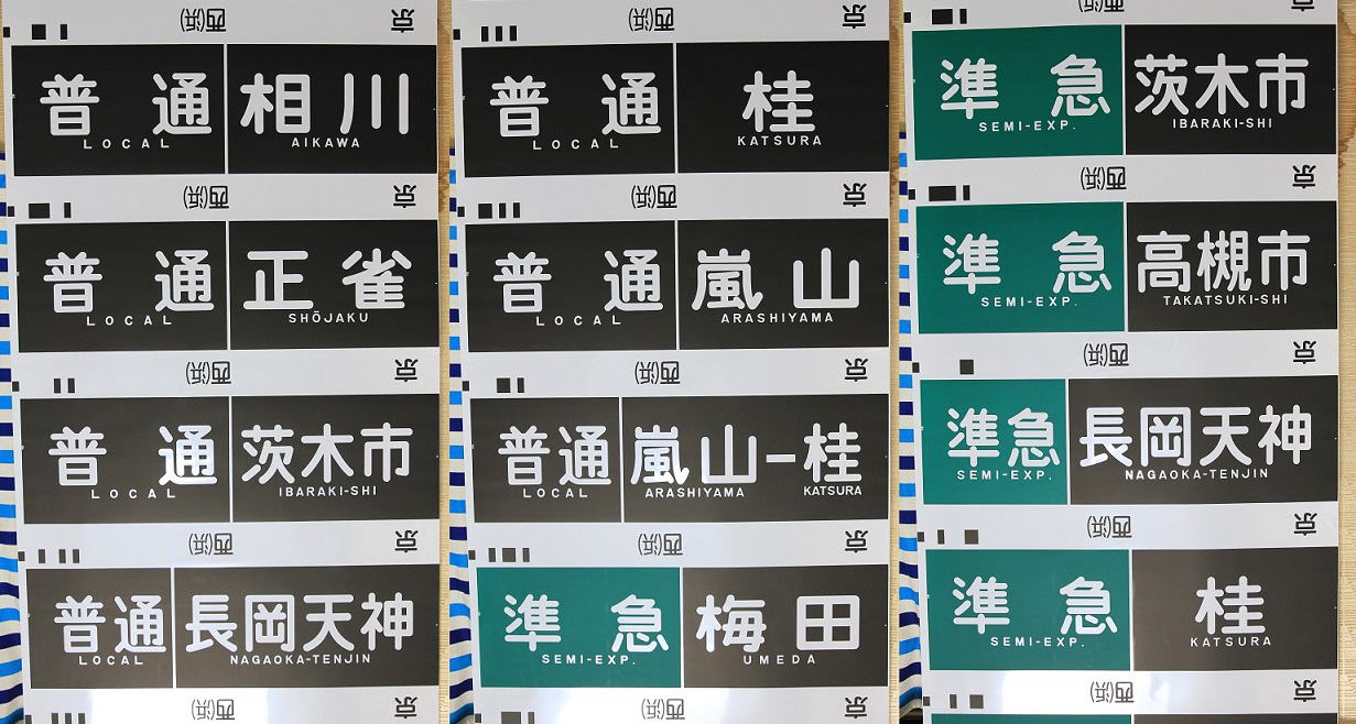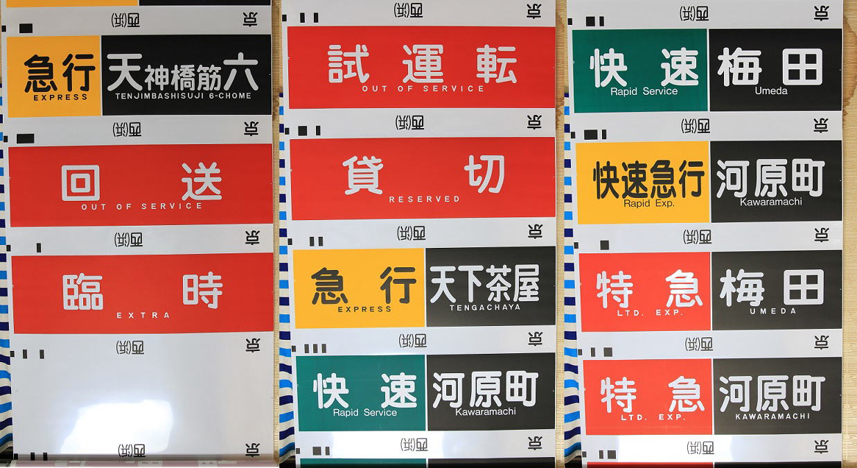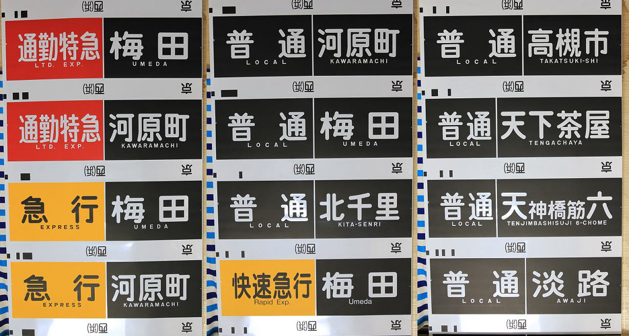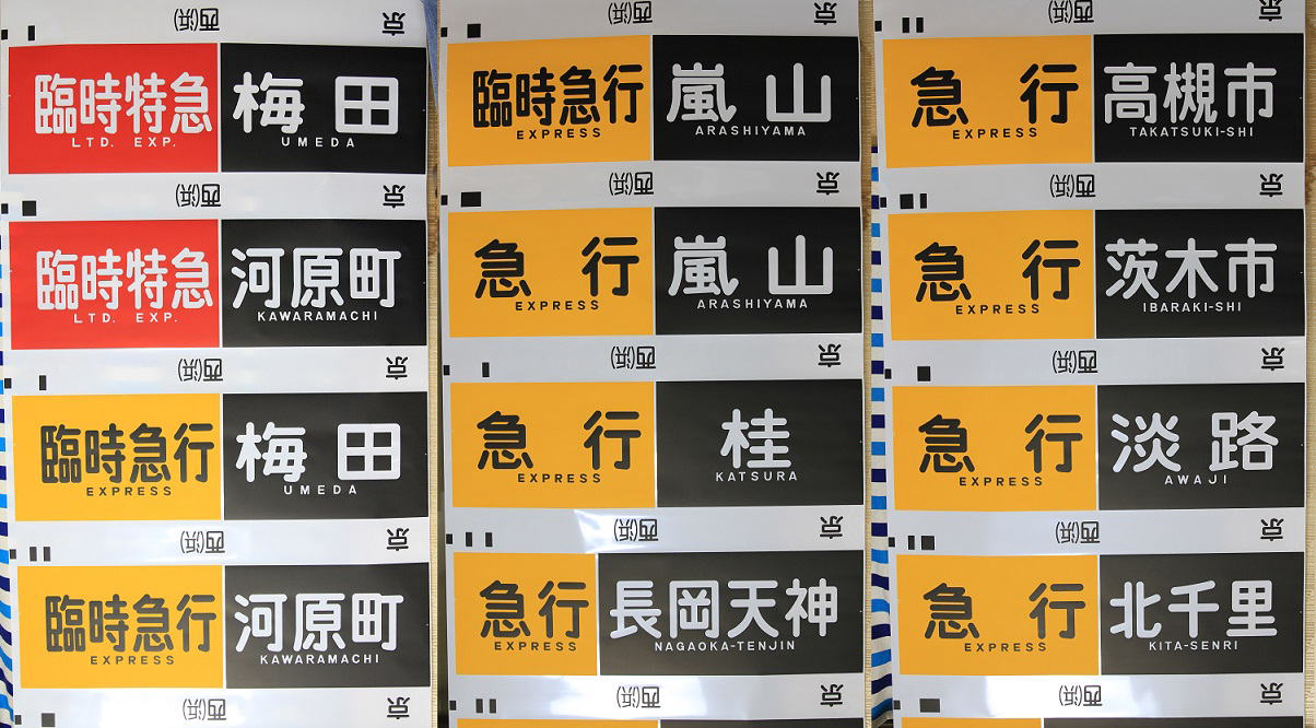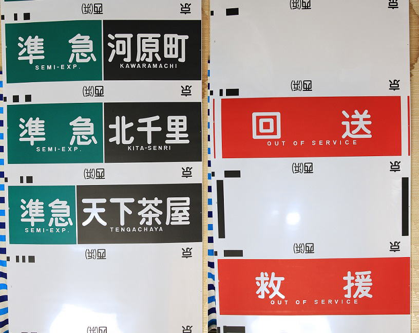 京都線3300系・5300系の側面幕。93年製から急行のカラーが反転して快速急行と同じ黄色になっている。 これを機に「動物園前」の表示が消されている。 後に21・22・23・33の空白に快速と快速急行が追加印刷された。基本は旧書体英大文字だが新しく刷った箇所は現行書体となっている。