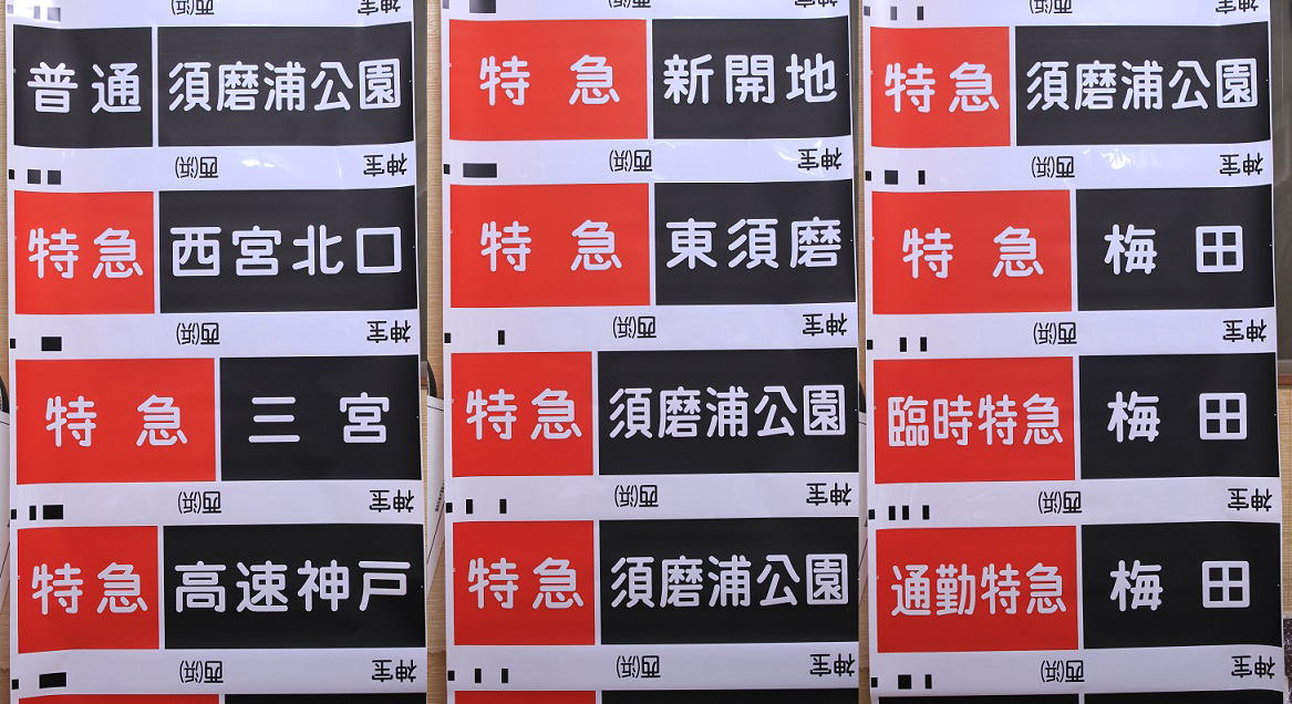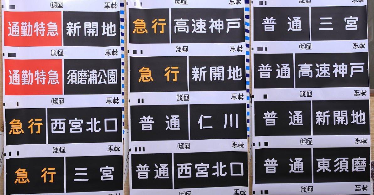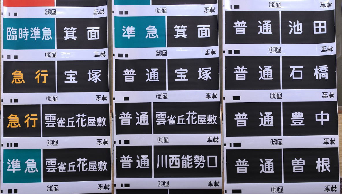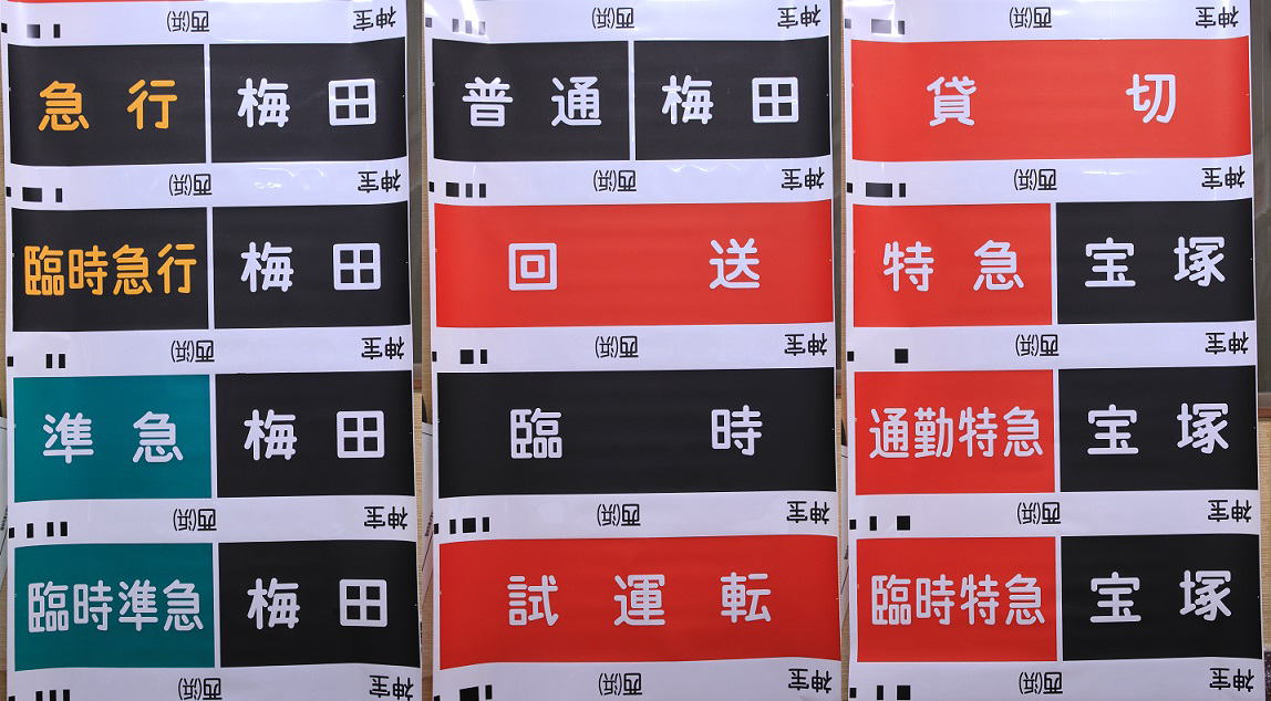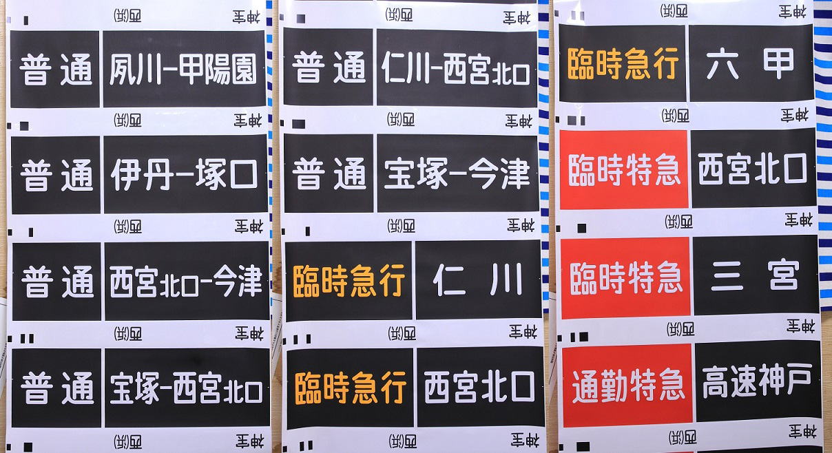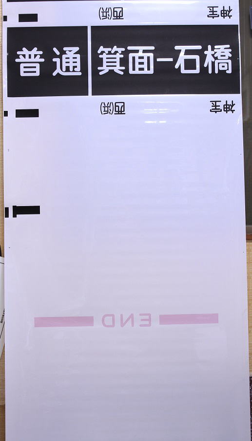 81年に在来車への表示幕改造が始まり、その際に取り付けられた最初の側面幕。 英文字は入っておらず、文字自体も一回り小さくなっています。 臨時急行六甲や臨時準急箕面など見慣れぬ表示も入っております。当時表示機会はありませんでしたが今津線が今津まで直通してたので宝塚ー今津表示もあります。