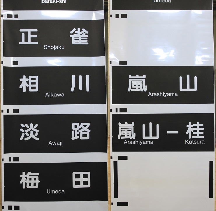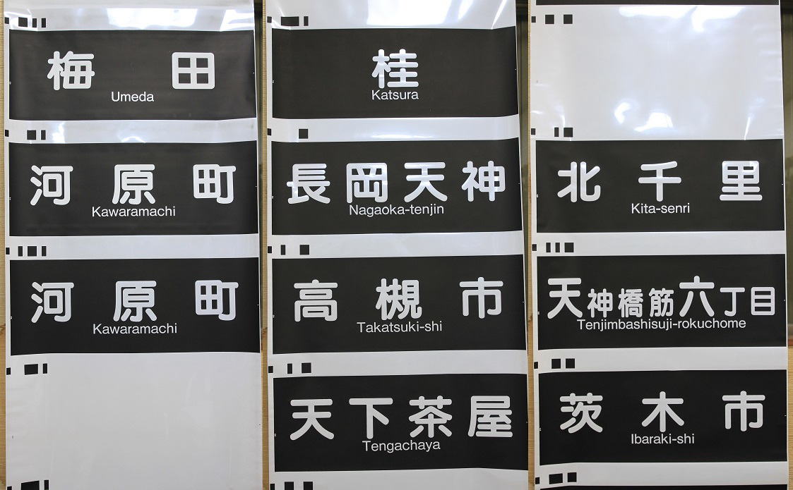 京都線SPC式の行先幕。従来は「天神橋筋六」だったのが「天神橋筋六丁目」のフルネームで表示されるようになりました。