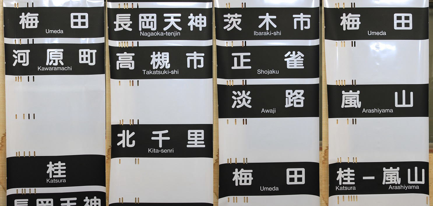 京都線用B式の行先幕。6300系専用の物です。物理的に地下鉄へは入れないので天下茶屋、天神橋筋六丁目はありません。