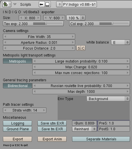 ”File”>”Export”>”Indigo v0.5beta”の順にBlenderのボタンを選択すると“Scripts Window”というサブウィンドウが表示されます。(図3)