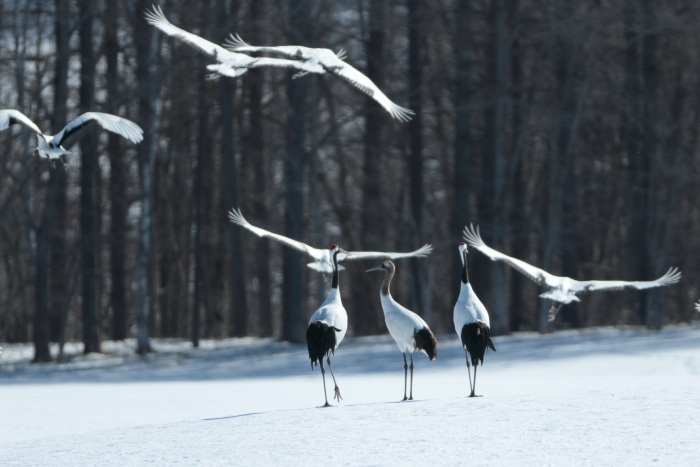 くるくると円を描くように舞う姿はまさに宮廷舞踏会のようで、BGMにウィンナワルツを入れたいくらい。よく見ると体を大きくひねって、それでもしっかり相手の顔を見て踊る。上の写真の左のタンチョウ、首と下半身の向いている方向が違うのがわかります。