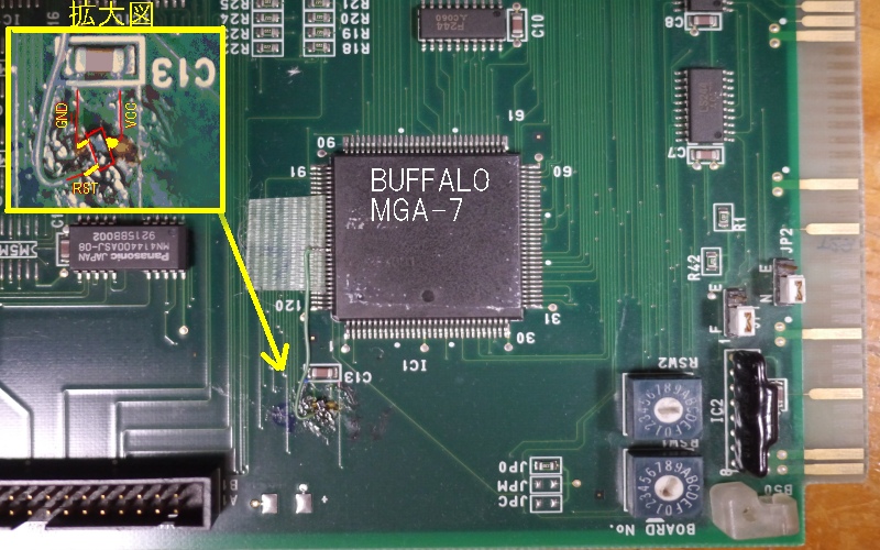 - 1.CバスのRESET信号とMGA-7チップの導通のあるピンを調べる(探す)