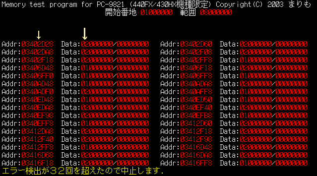 2003-4-26 0.01 NMI trapの割り込みベクタ設定を間違えていたのを修正 0.02 同じアドレスでテスト直後に反転ビットですぐテストするように変更 2003-5-12 0.03 チップセット430FX機種、ノートの430MX機種にも対応 2026-3-23 スクリーンショットの図とその解説を追記
