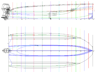 再検討中の排水量船型は4サイクル(L仕様)を採用したので後部浮力を増すように修正した。![]()