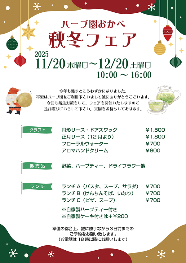 ご来園は3日前までにご予約をお願いいたします (お電話は18:00以降にお願いします)
