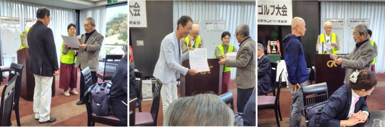| 令和6年10月30日 | 第13回市星連ゴルフ大会は8:00から、交野カントリー倶楽部において113名が参加し、開催されました。 (広報8月号に参加募集記事を掲載、参加申込は9月会長会でした。) 上位成績 優勝:新庄氏(倉治)Gross87、Hdcp18.0、Net69.0 準優勝:山口氏(倉治)Gross81、Hdcp12.0、Net69 第3位:桐山氏(天野が原)Gross85、Hdcp14.4、Net70.6 +++4位:平岡氏、5位:私市氏、6~10位入賞、以降5位区切りで飛賞 全員のスコアは、この項をクリックかタップするとご覧になれます。 |