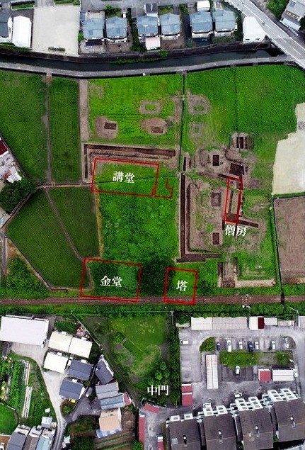 判明した伽藍配置は法起寺式(金堂を西に塔を東に、講堂を背後に配する)であった。さらに講堂東側には僧房とみられる掘立式建物跡も発見される。