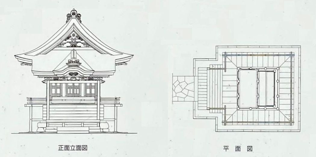 屋根は宝形造鉄板葺で、頂部に露盤・宝珠を置く。軒は一軒疎垂木である。土台に角柱を立て、足固貫・内法貫を通し、内法長押を打ち、飛貫を通し、舟肘木を置いて軒を受ける。正面に切目縁が付き、正面三間は引違いガラス戸を立て、上部は漆喰壁である。