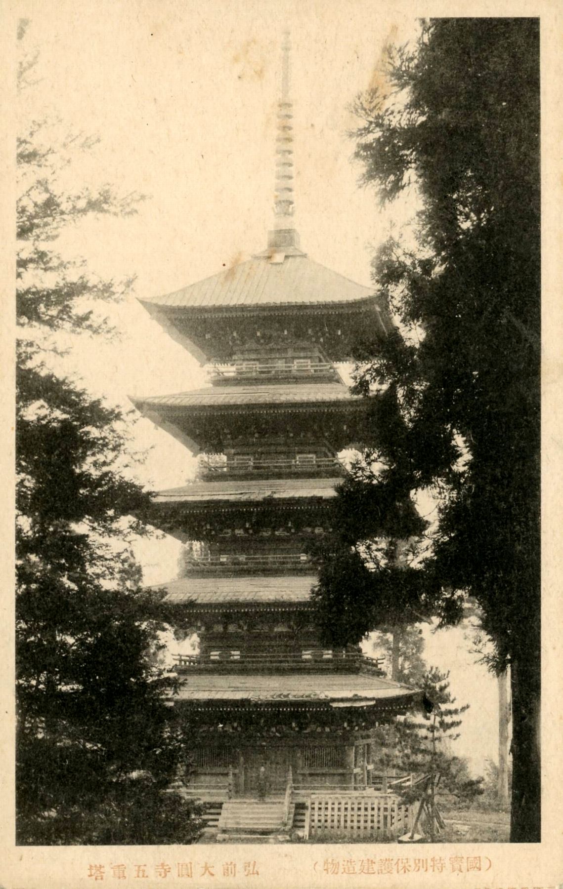 弘前大圓寺五重塔絵葉書2:特物保護建造物(国宝)とあるので、明治30年(古社寺保存法制定)以降、昭和20年以前の印刷であろう。