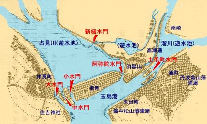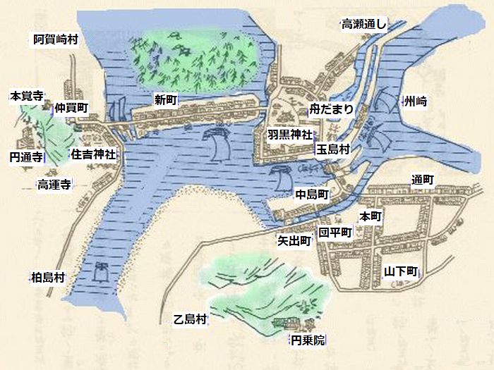 2025/12/18追加: ◇高瀬通し舟溜まり跡 ○サイト:倉敷市 > 文化・観光・スポーツ > 観光・魅力発信 > 観光情報 > みなと玉島空間 > 玉島ぶらっと > 玉島の史跡紹介 > 玉島の史跡紹介 常盤町・栄町・新地町(羽黒神社周辺) では次のようにいう。 「所在:玉島中央町1丁目7ー10(新地町・豊島屋南)」 (※)玉島中央町1丁目7ー10(豊島屋南)とは「高瀬通し舟だまり跡」の説明板設置場所の住所である。 「松山藩水谷候が玉島阿賀崎新田を開拓した万治寛文延宝にかけての約330年前、高梁川の水を入れた灌漑、水運両用の高瀬通しが船穂町水江の堅盤谷(カキワダニ)から糸崎七島を経て、玉島舟だまりまで91粁巾37米ー8.5米で開通された。 (中略) 荷を積み下ろす舟だまりは、羽黒山東側のこのあたり(※)約10アール(※)の水域であった。 羽黒山北側に延びる水路は、新町裏側に通じ阿弥陀水門から舟は港に出た。 明治になってからは、港町に地下トンネルが出来、舟はそこから港に出た。 昭和になって、高瀬通しはその機能を失い道路となり、家並みが建ち現代に至った。」 (※)「羽黒山東側のこのあたり」とは、「高瀬通し舟だまり跡」の説明板設置場所付近をいう。 (※)「10アール」とは1000uで、尺貫法でいえば約1反、坪でいえば約300坪である。 以上など参考に「高瀬通し舟だまり」の跡を探りと次のような結論となる。 推定玉島高瀬通し舟だまり跡:Yahoo地図 より 推定舟だまりは中央の(株)豊島屋本社・工場のある敷地を中心に、地図上に表示した@ABCDで囲まれた船底形の区画が「高瀬通し舟だまり」と推定される。 1)Bは「高瀬通し舟だまり跡」の説明板が設置されている場所である。 2)卍青瀧寺と表示している場所は明治の神仏分離の処置で羽黒山から下山し、新たに造られた新「清瀧寺」のある場所である。 (現在では、清瀧寺は再び羽黒山上に復帰している) 3)高瀬通しは玉島往来に沿って西側に掘削されていたが、この付近では埋めてられ道路の一部に転用されているようである。 地図上、玉島往来の西側に「用水路」(水路)が描かれ、現地で見ると、石垣で築かれ「高瀬通し」の遺構のようにも見える。 しかし、この「用水路」は高瀬通しではなく、「江戸末期の玉島港町分割支配略図」」などに見られるように 「本所悪水川」の名残りであり、「高瀬通し」の遺構ではない。 4)「本所悪水川」は水門を経て、玉島往来の下を暗渠で「溜川」と繋がる。 また、「溜川」は水門を経て、玉島港と繋がる。 ◇近世玉島の成立と干拓、玉島港の繁栄 ○「岡山の港」岡山文庫65、巌津政右衛門、日本文教出版、昭和50年 より 古代から中世の瀬戸内航路は児嶋の北側を通るものであった(児嶋は当時は嶋であった)。そして西行きの船は児嶋の北を通り連島の北を通り、さらに船は乙島と柏島の間を南下し、水島灘に出るものであった。(連島・乙島・柏島も往時は嶋であった)。 中世末期には藤戸海峡(児嶋の北)は通船不能となり、児嶋の南が瀬戸内航路となる。 寛永6年(1629)連島の北面新田と西阿知の河内新田が開発され、連島は陸続きとなり、東高梁川の流路が決まる。 寛永元年から正保元年(1645)の間に長尾新田・船穂新田が完成し、萬治2年(1659)爪埼・上成・古水門までの干拓が完成し乙島が陸続きとなる。つまり西高梁川の流路が決まる。 さらに寛文4年(1664)水谷氏は矢出から羽黒山の達する新堤と羽黒山から糸崎橋(※)までの堤防を築き、諸所に水門を設ける。 (※)糸崎とはよく分からないが、これは、あるいは「爪崎」の誤植であるかも知れない。 これにより、現在の通町・本町・団平町・矢出町・中島などの開発が進む。 寛文8年(1668)西高梁川右岸を検地し玉島村と命名、上成と爪崎を玉島村の枝村とする。 寛文11年水谷勝宗、阿賀崎新田を完成させ、同時に玉島西部に港を作る。この玉島港は旧乙島と旧柏島に挟まれた南北の長い港であり、現在もこの形を引き継ぐ。 阿賀崎新田の築堤は長さ約400m、幅約50mで、築堤上には港問屋の屋敷割がなされ、海岸沿いにはナマコ壁の倉庫が並ぶ景観となる。この問屋街は後に新町と呼ばれ、問屋ははじめ10軒であったが元禄年中には43軒を数える。 さらに港湾の浚渫を行い、千石船の接岸及び出入りが可能となる工事も実施する。 また萬治2年水谷勝宗は浅口郡水江(船穂水江)に堰堤を築き、水門・閘門を設け、船穂・長尾を経て玉島に至る延長約10kmの新川を掘り、高梁川を往来する高瀬舟を新川に導入する。 新川は「高瀬通し」と称し、新地町の南端から暗渠で連絡が可能であった。 高瀬舟は松山藩の蔵米を、また備中奥地の物産を玉島に運び、帰り荷には塩や肥料を積んで帰った。 まさに玉島は松山藩の外港の役割を果たす。 玉島港には阿波の藍問屋の船がよく入港し、近畿・九州方面の船も入港した。 江戸中期には日本海を西下し、関門海峡を通る北前船の入港が盛になる。 北前船はニシンの〆粕(しめかす)を主とし、これは玉島付近の主生産物であった綿の栽培に必要な肥料であった。玉島港