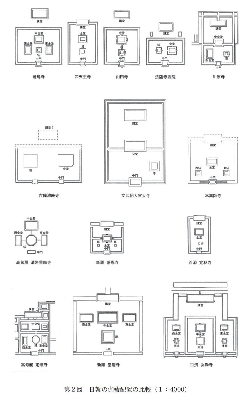 ・発掘調査の結果、南門の北に塔、東に金堂、西に講堂の伽藍配置を採るとされた。