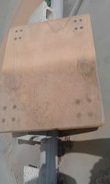 ピンクノズル口径6ミリ エアー圧0.3Mpaで50 センチ離れて噴射です 噴射パターンは約25セ ンチで、半分を研磨す るのに要した時間は10 秒程度です。 やはり下地の木材が少 し彫れてザラザラです。 |