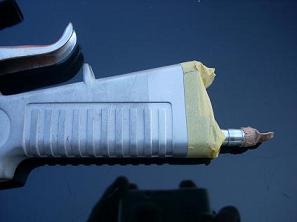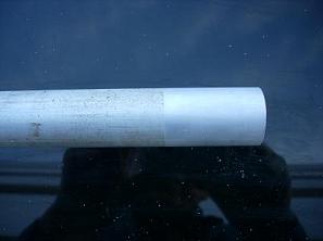 | 最初にマスキングテープのすぐ左側の1cm幅をガラスビーズ#80でドライブラストしました。 光っている部分です。 エアー量が毎分150リットル程度コンスタントに出るコンプレッサーならピンクノズルの口径、 5又は6ミリを使用する事により研磨面積も大きくなります。 |