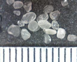 この珪砂は全粒度 販売終了致しました 一流メーカーの高額品で銘柄指定で仕入れておりましたが、 突然中身が粗悪品に入れ変わっていたためです・・。 写真は国産 高級珪砂 #5 新品 (新モース硬度 約 9) 粒度はアルミナ#50程度です 球体加工の珪砂#5です。1メモリは0.5ミリ 平均粒度0.4ミリです #6は平均粒度0.3ミリ #7は平均粒度0.2ミリ 透明度の高いガラスのような高級品で、熱処理をしたように球体に なっています。 原料成分を見ますと限りなくガラスに近いようです。 吸上循環式でも粉塵が少なくて便利です。 球体加工の為に一般珪砂より滑らかに研磨できて硬いようです。 木材に使用しても刺さらずに具合が良さそうです。 |