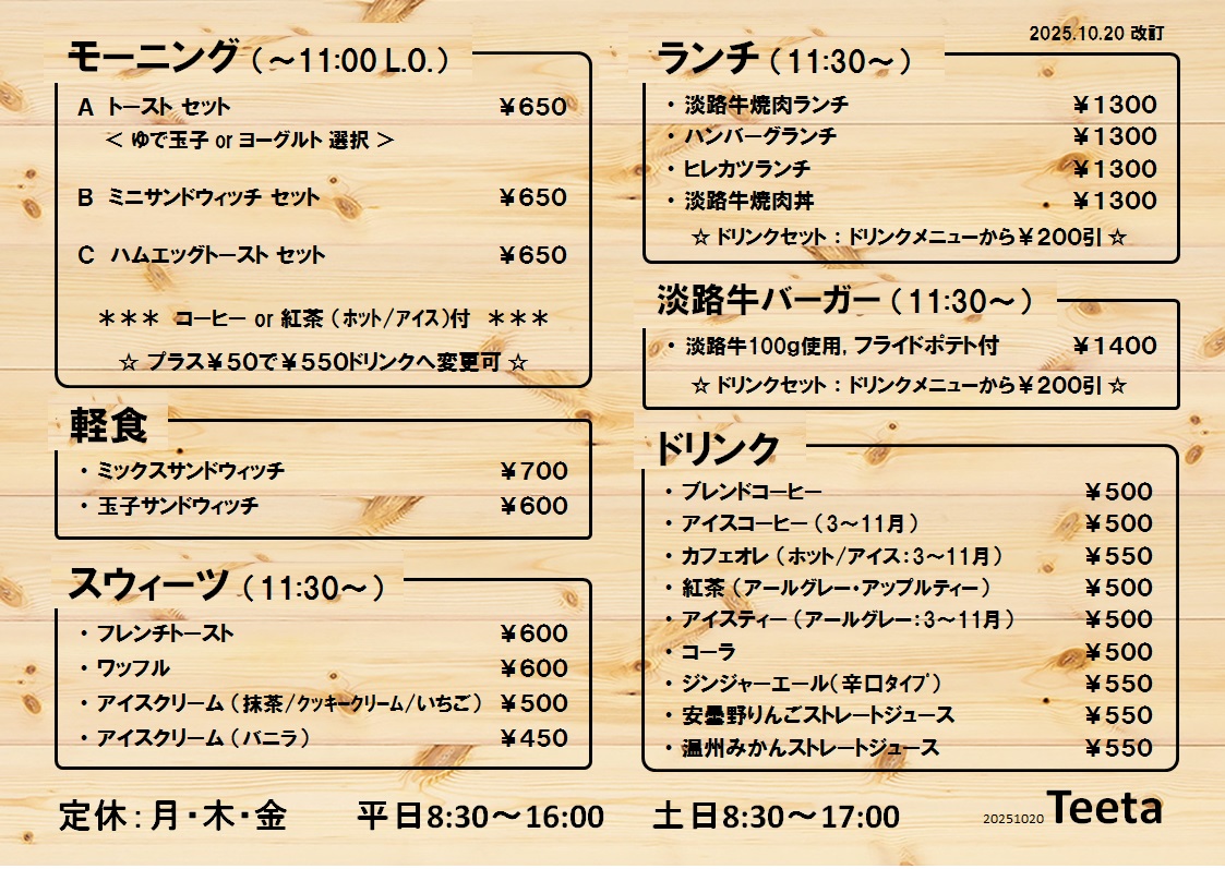 |  | ログハウスカフェ ティータ(Teeta Cafe) 〒656-0661 兵庫県南あわじ市阿那賀1629-318 (晴海ヶ丘:2-1B) Tel :050-3390-8712 Tel :0799-53-6710 Mail:teeta.cafe@gmail.com |